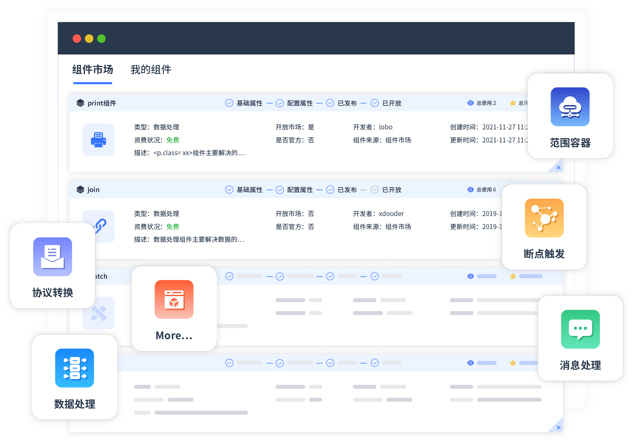 针对集成场景,,,,,,,,,小微钱包提供组件市场,,,,,,,例如协议转换、、、、、、、、、、消息处理、、、、、、、、、文件操作等。。。。。。。。。除平台提供的组件外,,,,,,客户可以自定义所需组件。。。。。。